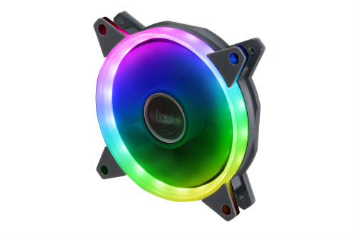 Extra tichý ventilátor s měnitelnými barvami LED podsvícení. Je vybaven jak standardním 3pinovým konektorem pro regulaci otáček, tak i 4pinovým konektorem pro regulaci adresovatelného RGB LED osvětlení. Průměr ventilátoru je 120 mm.