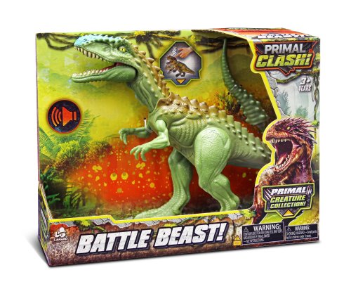 Primal Clash! Bitevní dinosaurus. Velikost figurky 21 cm. Dinosaurus má pohyblivé končetiny, čelist, a vydává zvukové efekty. Aktivace efektů sklopením hlavy. 3xAG13 baterie, součástí balení. 2 varianty - Carnotaurus, Gigantosaurus.
