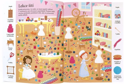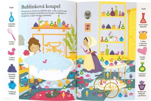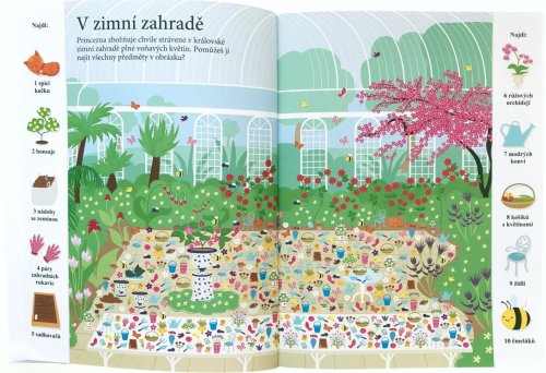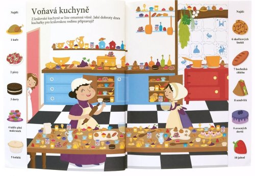 Najdi více než 1000 různých předmětů schovaných v obrázcích. Procvičuj své smysly, zatímco se budeš procházet rozlehlými prostory královského paláce. Najdeš dvě královské koruny, pět růžových klobouků, tři dorty nebo sedm majordomů? V tomto sešitu tě čeká palác plný nablýskaných skvostů, šatů, lahodných jídel, rytířů a služebnictva. Princezna vstává do krásného dne, jde nakouknout do královské kuchyně, hřebelcovat koně, cvičit se ve zpěvu a připravit se na večerní slavnostní ples. Prožij tento úžasně kouzelný den s princeznou! Nahlédni do jejích komnat, do královské pokladnice, stájí, kuchyně i sklepení a pomoz jí s přípravou na ples. Zabav se hledáním více než tisícovky různých předmětů a lidí šikovně ukrytých v prostorách královského paláce. Kolik z nich se ti podaří najít?