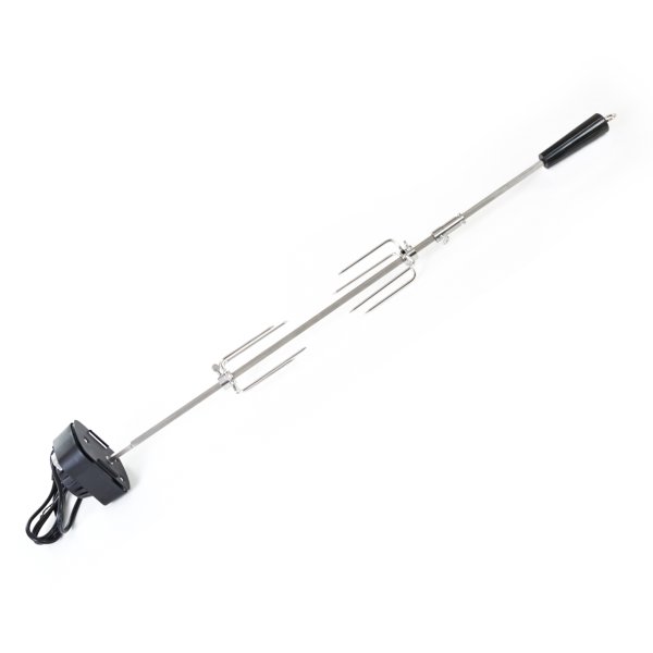 Z jedné strany je jehla opatřena odnímatelným plastovým držadlem, na kterém je praktické očko pro uchycení. Z druhé strany se nachází motorek v plastovém krytu, na kterém je umístěno tlačítko na zapínání / vypínání. Motorek s napětím 230 V jednoduše zapojíte do elektřiny pomocí kabelu v délce cca 125 cm. Motorek s jehlou otáčí rychlostí asi 2 otáčky za minutu, aby se připravovaný pokrm nepřipékal, ale pekl se rovnoměrně.