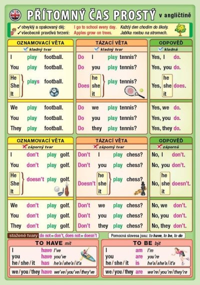 Přehledně zpracované a bohatě ilustrované téma přítomný čas prostý v angličtině. Titul rovněž obsahuje pravidla tvoření 3. osoby jednotného čísla, doplňovací otázky a frekvenční příslovce.