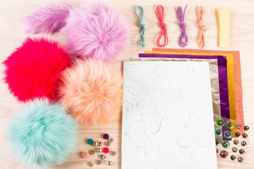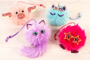 Přívěsky, roztomilé chlupaté koule. Obsahuje: 4 plyšové koule, 1 plyšový ocásek, pěnové doplňky, oči a korálky, 4 barevné fólie, 4 barvy voskované šňůry (2 m), oboustranná páska, instrukce.