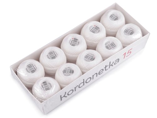 Háčkovací a paličkovací přízi Kordonetku nabízíme v několika tloušťkách. Je velice kvalitní, ze 100% bavlny. Je určená na háčkování deček, přehozů, záclon, apod. Je oblíbená na háčkování malých andělíčků a vánočních či velikonočních ozdob. Příze je vhodná i na paličkování. Každé klubko váží 20 g. Kordonetka č. 10 má návin cca 110 m a průměr příze 0,80 mm. Kordonetka č. 15 má návin cca 134 m a průměr příze 0,77 mm. Kordonetka č. 30 má návin cca 167 m a průměr příze 0,68 mm. Kordonetka č. 50 má návin cca 227 m a průměr příze 0,56 mm. Kordonetka č. 60 má návin cca 250 m a průměr příze 0,44 mm. Kordonetka č. 80 má návin cca 340 m a průměr příze 0,30 mm. Přízi dodáváme v balení po 10 ks v krabici bez víka, která je potažená samosmršťovací fólií.