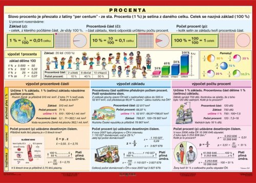 Naučná tabulka přináší souhrn učiva o procentech. Přední stranu tvoří kromě vysvětlení základních pojmů – procento, základ, procentuální část, počet procent, výpočet 1% – i přehledně ilustrovaná tabulka s řešením slovních úloh na výpočet procent, procentuální části a celku, a to pomocí přechodu přes 1% nebo pomocí přímé úměry a vzorce. Zadní stranu tvoří především grafické vyjádření procent s příklady na výpočet procentuální části a procent.