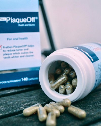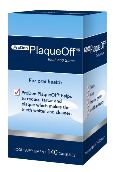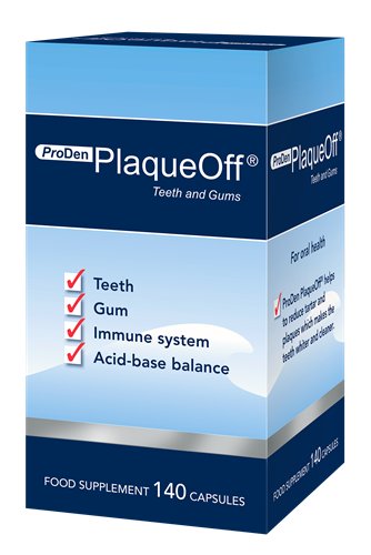 ProDen PlaqueOff® Teeth and Gums je patentovaný, 100% přírodní doplněk stravy pro lidi, který pomáhá odstraňovat zubní kámen a zubní plak, čímž zuby bělí a čistí, a napomáhá tak udržovat zdraví zubů a ústní dutiny. Na rozdíl od jiných metod péče o zuby ProDen PlaqueOff® Teeth and Gums funguje systémově, tj. prostřednictvím krevního oběhu. Zlepšení jsou obvykle pozorována během pěti až osmi týdnů. Průzkumy ukazují, že u 75 % dospělých lidí, kteří si čistí zuby dvakrát denně, je na zubech stále viditelný zubní plak. Jednoduše užívejte dvě tablety denně! Produkt je ve formě snadno spolknutelných kapslí, které obsahují důležité vitamíny a minerální látky a jsou bez umělých barviv, konzervačních látek, lepku a cukru.