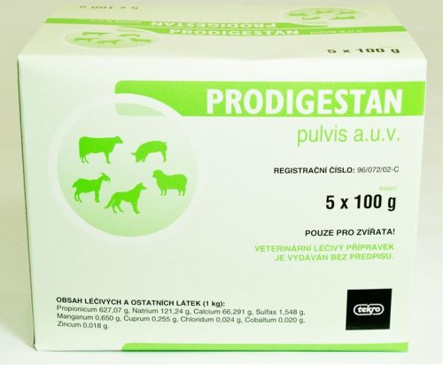 Registrační číslo ČR 96/072/02-C Příznak preskripce ČR VP ATC skupina Q01JA Registrační název + forma PRODIGESTAN plv. ad us. vet. Výrobce Tekro s.r.o., Praha, ČR. Držitel reg. rozhodnutí Tekro s.r.o., Praha, ČR. Složení - účinné látky Natrii propionas 506,6 mg, Calcii propionas 308 mg, Mangani sulfas,monohydricus 2 mg, Cupri sulfas pentahydricus 1 mg, Cobaltosi chloridum,hexahydricum 0,08 mg, Zinci sulfas heptahydricus 0,08 mg v 1 g. Složení - pomocné látky Lactosum monohydricum. Popis přípravku Bílý až žlutavý hydroskopický prášek. Druh obalu Sáček z folie Alufan PE, baleno jednotlivě nebo po 5 kusech do kartónové,krabice. Papírový pytel s PE vložkou nebo plastový kbelík. Balení 5 x 100 g, 5 kg, 10 kg, 25 kg. Indikační skupina Veterinaria - pharmaceutica, stomachikum, ruminatorium. Charakteristika Soli kyseliny propionové mají u přežvýkavců funkci hlavního prekurzora,glukózy. Kobalt má významné postavení zejména u přežvýkavců. Jako součást vitaminu,B12 je potřebný pro erytropoézu a má u přežvýkavců širší metabolické,využití. Mangan kromě principiální funkce při tvorbě komponentů chrupavky má,specifický účinek jako kofaktor enzymu glykosyl - transferázy. Zinek je součastí řady enzymů jako jsou anhydráza kyseliny uhličité,a alkalické fosfatázy. Zinek je potřebný především pro syntézu RNA,a normální růst a obnova tkaniv. Měď je podstatnou složkou mnoho systémů v těle. Je integrální součástí,nezbytných enzymů jako je cytochrom oxydáza a řady enzymů metabolizujících,aminokyselin. Sírany působí adstringentně na zánětlivou sliznici předžaludků, zúžením,cév působí protizánětlivě, na stěnu předžaludků, vytvářejí ochranný film,koagulovaných proteinů. Farmakokinetické údaje Přípravek je určený k lokálnímu působení v trávicím traktu, při částečné,resorpci některých složek dochází k jejich metabolizaci v játrech,a enterocytech. Indikace / použití Cílový druh zvířat: skot, ovce, kozy, prasata, psi. Gastrointestinální dysfunkce u přežvýkavců vznikající z nadměrného přívodu,lehce stravitelných glycidů, při náhlé změně krmné dávky a při nadměrném,zkrmovaní bílkovinných koncentrátů, při nevyhovující struktuře krmiv (malá,velikost částic), v počátečním období laktace, případně na zlepšení příjmu,krmiva. Jednoduchá indigesce, atonie bachoru, intoxikace z krmiva. Záněty,gastrointestinálního traktu přežvýkavců, prasat. Primární acetonemie,,ketonurie, hypoglykemie. Podpůrná terapie při steatóze jater, otravě amoniakem, poporodní paréze,,specifických a nespecifických střevních zánětech, sepsi a teplotě,,anorexii spojené s průjmem anebo zácpou, hubnutí a zpomalení růstu,,pohybových poruchách a teplotě, nedostatku minerálních látek, antibiotické,terapii, dehydratačních stavech, rachitidě, u psů při proktokolitidě. Kontraindikace Neprůchodnost trávicí trubice při podávaní léku sondou. Nežádoucí účinky Nejsou známé. Upozornění U skotu v průběhu léčby doporučuje dieta s vyšším obsahem sena,a okopanin. Jaderné krmivo z krmné dávky vyloučit a postupně přidávat po,zlepšení zdravotního stavu. Dávkování Dospělý skot 2krát denně 100-150 g po dobu 2-5 dní, prasata 2krát denně,20-25 g po dobu 2-5 dní, psi 2krát denně 5 g po dobu 2-5 dní. U ostatních,zvířat jsou dávky úměrné menší podle hmotnosti. 1 zarovnaná polévková lžíce obsahuje 6-7 g prášku. Způsob použití Dobře rozpuštěný prášek v teplém nápoji (vodě, heřmánkovém čaji) u skotu,jícnovou sondou přímo do bachoru anebo z láhve do ústní dutiny, případně,zamíchaný v krmivu, u prasat a psů z láhve do ústní dutiny, případně,zamíchaný v krmivu. Ochranná lhůta veterinární Bez ochranných lhůt. Použití, expirace 24, po prvním otevření 15 týdnů, po rozpuštění ve vodě nebo zamíchání do,krmiva ihned spotřebovat. Způsob skladování Při teplotě do 25 st. C, v suchu. Datum zpracování 18.10.2010 Autor článku Dle SPC.