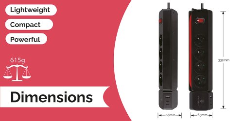 Prodlužovací zásuvka • 4 x AC (230V, 16A, 3680W) výstup • 1 x USB-A (5V/3A) • 2 x USB-C (5V/3A) • USB-A + 2 x USB-C (5V/3,4A, 17W) • flexibilní design s možností rozdělení • kompaktní rozměry • možnost zapojení až 7 zařízení současně