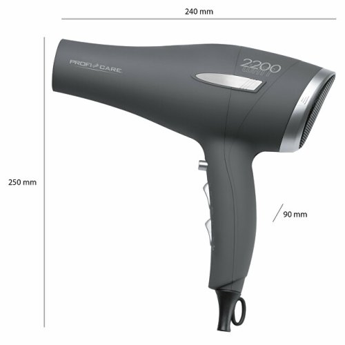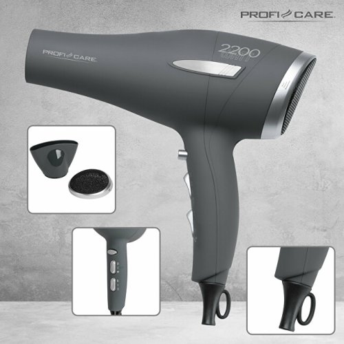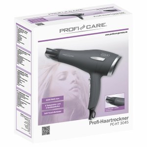 Profesionální fén značky ProfiCare s výkonem až 2 200 W. Lze nastavit až 3 stupně výkonu/teploty a 2 stupně rychlosti ventilátoru + Cool Shot. Součástí balení je tvarovaná tryska otočná o 360 °, která je odnímatelná. Pouzdro fénu je vyrobeno ze Soft Touch materiálu. Fén je vybaven filtrem přívodu vzduchu, který je také odnímatelný a v balení jsou další 2 náhradní filtry. Je vybaven ochranou proti přehřátí a závěsným okem. Napájení je 220-240 V, 50/60 Hz, výkon je 1 800-2 200 W.