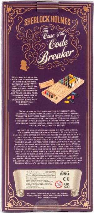 Hra Master Logic inspirovaná Sherlockem Holmesem od společnosti Professor Puzzle je logická hra, jejímž cílem je vytvořit řadu čtyř kolíčků podle skrytého vzoru a soupeřovy nápovědy. Moriarty vyzval Holmese na ultimátní souboj jeden proti jednomu a k tomu, aby se stal vítězem, bude potřebovat všechny Holmesovy pověstné schopnosti luštění kódů. Holmes musí odvodit správné pořadí čtyř barevných kolíčků ukrytých pod dřevěnou krabičkou. Na správný odhad má však pouhých deset pokusů. Podaří se také vám určit správnou barvu a pořadí čtyř ukrytých kolíčků?