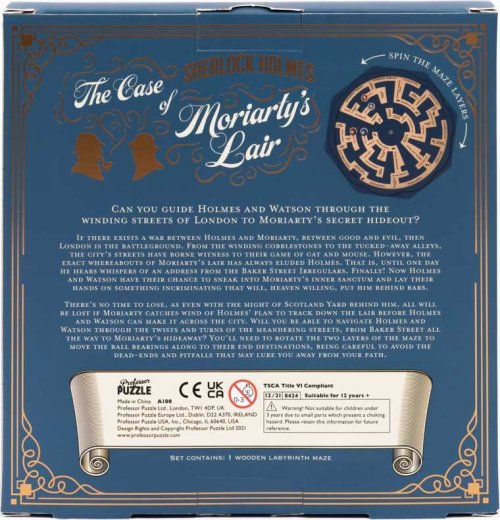 Holmesovi vždy unikala přesná poloha Moriartyho doupěte. Tedy až do chvíle, kdy jednoho dne zaslechne šuškandu o adrese od návštěvníků z Baker Street. Konečně! Podaří se vám pomoci Holmesovi a Watsonovi proplout spletitými uličkami z Baker Street až do Moriartyho úkrytu? Budete muset otáčet oběma vrstvami bludiště, abyste kuličková ložiska posunuli k jejich cíli. Dávejte pozor, abyste se vyhnuli slepým uličkám a nástrahám, které vás mohou svést z cesty!