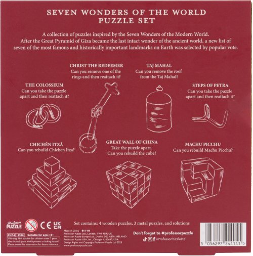 Kolekce Lost +amp; Found: Ponořte se do minulosti s touto sérií hlavolamů inspirovaných starověkými civilizacemi a odhalte příběhy ukryté v každém z nich! Sedm divů. Sedm výzev. Rozlož a slož zázraky světa! Hlavolamy inspirované nejikoničtějšími stavbami moderní doby. Balení obsahuje: 3x kovový hlavolam, 4x dřevěný hlavolam a pergamen s řešením. Poznámka: Řešení je v anglickém jazyce.