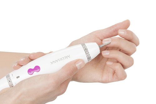 Bruska Medisana MP 840 na manikúru a pedikúru se jednoduše ovládá a je ideálním pomocníkem při péči o Vaše ruce, nohy a nehty. Lze využít při ošetření zarostlých, silných a ztvrdlých nehtů, pro ošetření zrohovatělé kůže, mozolů a okrajů kuřích ok. Je vhodná také pro kosmetickou péči o ruce a nehty. Díky vyměnitelným nástavcům (6 safírových, 2 vyhlazovací, 2 leštící) ošetříte různé části Vašeho těla. Safírové nástavce mají dlouhou životnost. Vhodná i pro diabetiky. Snazší aplikace díky LED světlu, které osvětluje broušenou plochu. Přístroj disponuje 2 směry otáčení a 3 rychlostmi.