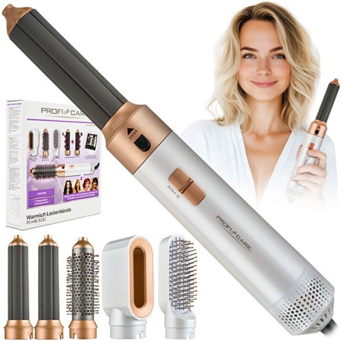 Kulmofén ProfiCare HAS 3132 G Multifunkční styler 4 v 1 pro sušení, tvarování, objem i vlny v jednom přístroji Pět výměnných nástavců pro snadné přepínání mezi stylingovými technikami Tři úrovně teploty …