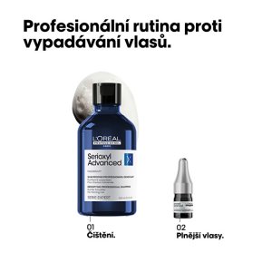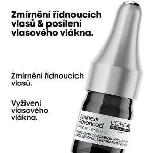 PROGRAM S DVOJITÝM ÚČINKEM: Intenzivní program pro řídnoucí vlasy, který přináší důležité živiny pro zahuštění a posílení vlasů STIMULUJE AKTIVITU KOŘÍNKŮ: Pomáhá růst novým, zdravým a silným vlasům L’Oréal Professionnel Aminexil Advanced je profesionální 6týdenní program proti vypadávání vlasů pro řídnoucí vlasy, který přináší zásadní živiny pro hustší a silnější vlasy. Program je obohacený o aminexil a Omega 6 komplex stimuluje činnost kořínků, čímž pomáhá v růstu novým, zdravým, silným vlasům. Díky masírování Aminexil Advanced do vlasové pokožky pomáhá toto vyživující složení zachovat hustotu vlasů. Toto profesionální složení je schváleno a používáno kadeřníky a je součástí jejich salonního ošetření v salonech L’Oréal Professionnel Paris na celém světě. CHRÁNÍ HUSTOTU VLASŮ: Díky masírování Aminexil Advanced do vlasové pokožky pomáhá toto vyživující složení zachovat hustotu vlasů. Profesionální 6týdenní program pro řídnoucí vlasy, který přináší zásadní živiny pro větší hustotu a posílení vlasů