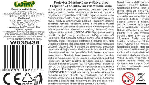 Projektor 24 snímků se zvířátky - Dino. Obsahuje projektor, 3 kotouče se snímky (celkem 24 snímků), 12 figurek dinosaurů. Délka projektoru 11,5 cm, velikost dinosaurů 5 - 6 cm. 3xAG13 baterie do projektoru součástí. Přepínač ON/OFF na projektoru. Zaostřovací prstenec na projektoru.