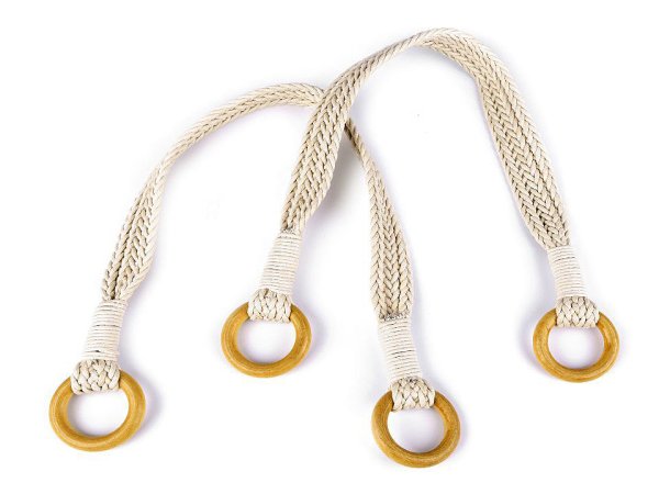 Proplétaná ucha na tašky jsou vyrobena z textilní voskované šňůry, která je na obou stranách zakončena dřevěnými kroužky. Ucha využijete při výrobě tašek nebo kabelek.Celková délka uch se může pohybovat v rozmezí 50 - 54 cm.