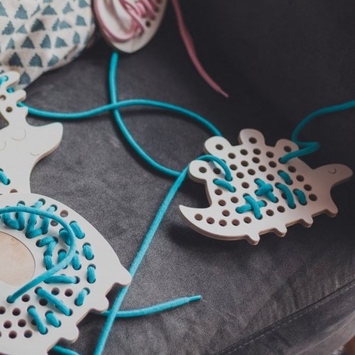 • dřevěná provlékací hračka pro rozvoj kreativity, fantazie a jemné motoriky