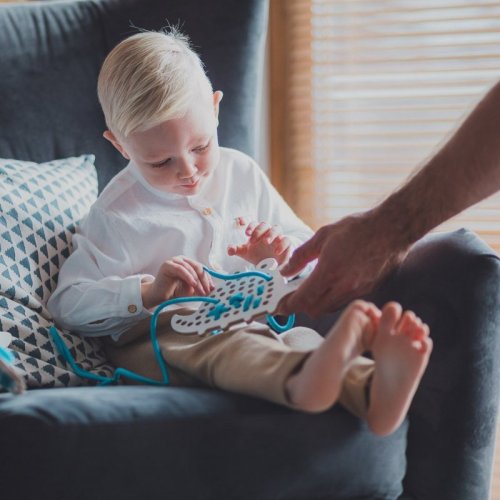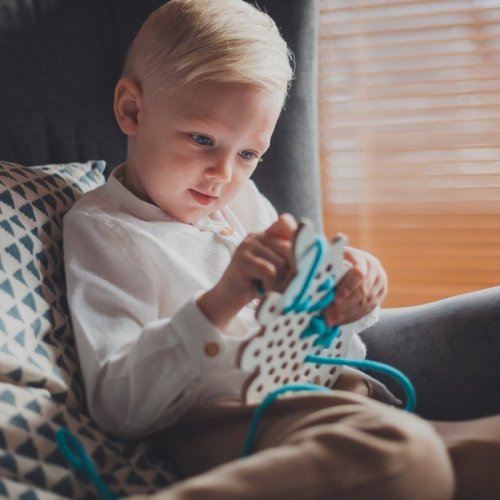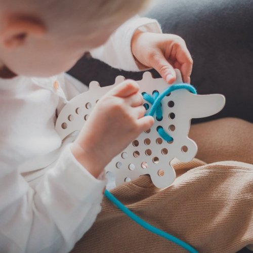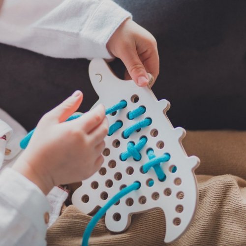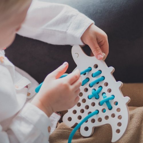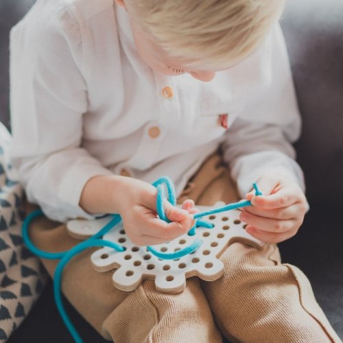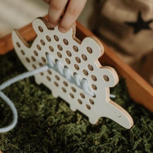 Dřevěná provlékací hračka rozvíjející kreativitu a představivost.