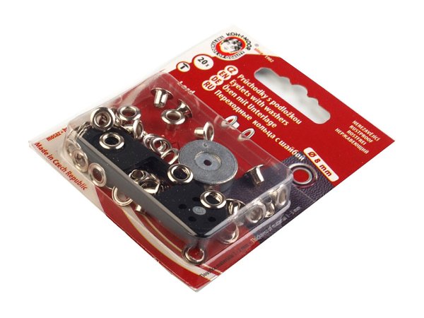 Kovová průchodka slouží k pohodlnému provlečení šňůry nebo gumy textilem. Najdete ji např. u stahování batohů. Využijete ji na materiál s tloušťkou 1 - 3 mm. Je složená ze dvou částí. Nereziví. V balení najdete 20 ks. Použití: Průchodku využijete především v oblasti textilní výroby, například při šití bund, mikin apod. Nýtování se provádí ručně mini lisem, který je součástí balení. Na vysekávání děr do materiálu vám doporučujeme sadu výsečníků.