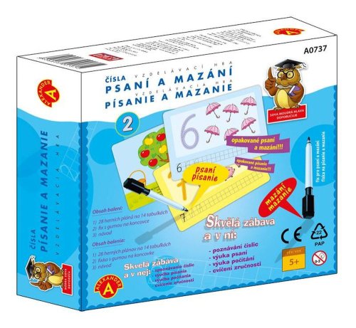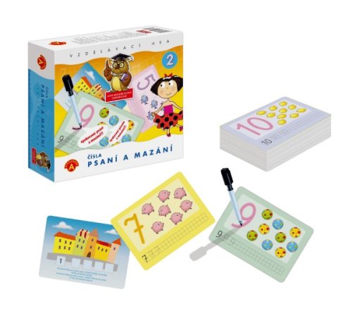 Hra se skládá z 28 naučných motivů na 14 tabulkách a mazací fixy. Na každém z 28 motivů se nachází jedna číslice. Řádky obsahují prostor pro psaní číslic. Každý znak obsahuje pomocnou přerušovanou čáru, která pomáhá při kreslení jeho tvaru. U číslic se nacházejí obrázky, jejichž počet značí procvičované číslo. Na všechny kartičky s úkoly lze psát a malovat fixem. Napsané texty lze snadno smazat speciální koncovkou na násadce fixu. Děti mohou opravovat chyby a používat tabulky opakovaně, v krabici. Rozměr balení: 19,5 x 18,5 x 5 cm Vhodné pro děti od 5 let.