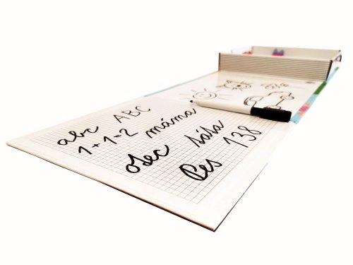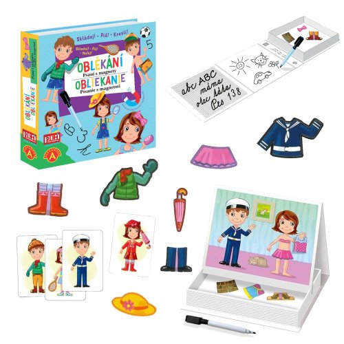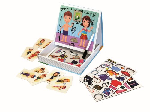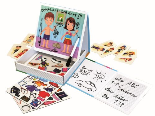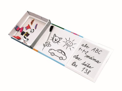 Všestranná hra, která povzbudí děti od 4 do 8 let ke kreativitě, aranžování, kreslení a psaní. Psaní, mazání a skládání magnetických obrázků - vše v jedné sadě. Skvělý trénink psaní písmenek, čísel a spousta volné plochy na malování mazací fixkou a skládání scének z magnetických obrázků... Rozvíjí jemnou motoriku a zručnost, ale také probouzí fantazii a při popisování veselých příběhů zlepšuje vyjadřovací schopnosti a slovní zásobu dětí. Díky magnetům jednotlivé dílky drží na podkladové desce a hra je proto vhodná i na cesty v autě.