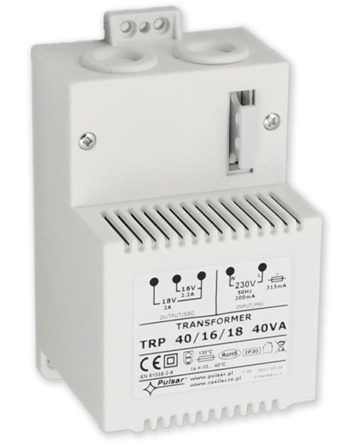 Transformátor pro napájení ústředen s plastovým krytem zcela kryjícím "živé" části trafa, se svorkovnicí a tavnou pojistkou. Transformátor je možné přichytit 4 šrouby.