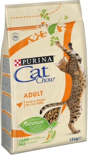 Kompletní a vyvážená výživa s vysokým podílem kuřete poskytne vaší kočce vše, co potřebuje pro svůj úžasný život. Již od roku 1926 odborníci společnosti PURINA spojují porozumění přirozeným požadavkům zvířat s přípravou správné výživy, aby mohli přispět k jejich celkovému zdraví a pohodě. Naše receptura s vysokým podílem krůty a specificky vybranými kvalitními zdroji bílkovin uspokojí přirozené potřeby kočky. Pečlivě připravené krmivo s přírodními složkami (petržel, špenát, mrkev, celozrnné obiloviny, čekanka a kvasnice) v chutné receptuře kočky spontánně preferují. PURINA CAT CHOW NaturiumTM je receptura se specifickou kombinací vlákniny z přírodních zdrojů. Obsahuje přírodní zdroje prebiotik, která prokazatelně zlepšují rovnováhu střevní mikroflóry a podporují zdraví trávicího traktu, aby kočka mohla získat ze své strany co nejvíce. Vitamín E podporuje přirozenou obranyschopnost kočky a vitamíny skupiny B jí pomáhají účinně využívat energii. Pečlivě připravená receptura: NEOBSAHUJE přidaná umělá dochucovadla NEOBSAHUJE přidaná barviva NEOBSAHUJE přidané umělé konzervační látky Složení: obiloviny (45 % celozrnné), maso a živočišné produkty (20 %**), bílkovinné extrakty rostlinného původu, oleje a tuky, vedlejší produkty rostlinného původu (2,7 % sušená řepná dužina, 0,07 % sušená petržel odpovídající 0,4 % petržele), zelenina* (2 % sušený kořen čekanky, 0,07 % sušená mrkev odpovídající 0,4 % mrkve, 0,07 % sušený špenát odpovídající 0,4 % špenátu), minerální látky, kvasnice* (0,3 %).