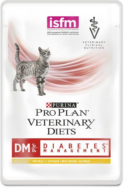 Složení: maso a výrobky živočišného původu (z toho kuře 4 %), ryby a vedlejší výrobky z ryb, vedlejší výrobky rostlinného původu, minerální látky. Doplňkové látky: m.j./kg : Vit A : 1 085; Vit D3 : 150; Vit E : 280 mg/kg : 3b103 : (Fe: 10,3); 3b202 : (I: 0,39); 3b405 : (Cu: 0,99); 3b503 : (Mn: 1,8); 3b605 : (Zn: 19); taurin : 1 468. Analytické složky: vlhkost 77 %, protein 13 %, obsah tuku 4,5 %, obsah anorganických látek 2,4 %, hrubá vláknina 0,6 %, škrob 0,8 %, celkové cukry < 0,5 %. Krmný návod: Doporučená doba používání je od počátku do 6 měsíců. Před použitím nebo před prodloužením doby používání se doporučuje vyžádat si stanovisko veterinárního lékaře. Voda musí být vždy k dispozici. 1 kapsička = 20 g granulí Feline DM™ St/Ox. Návody pro kombinované krmení jsou platné pouze pro současné podávání suchého a vlhkého krmiva Feline DM™ St/Ox. *Kočky s hmotností nad 8 kg: na každý další kg tělesné hmotnosti navyšte denní krmnou dávku o 2/3 kapsičky nebo 13 g granulí PPVD DM™ St/Ox.