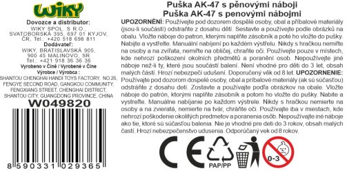 Puška AK-47 s patronami a pěnovými náboji. Velikost 91 cm. Puška rozložitelná na jednotlivé části. Součástí tlumič, hledí, 8 patron, 20 pěnových nábojů (10 standardních, 10 s přísavkou). Návod s obrázky a instrukcemi na sestavení a používání na zadní straně obalu.