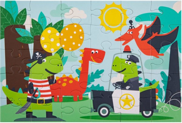 Nádherné dětské puzzle obsahující 30 velkých dílků, které po složení vytvoří obrázek s motivem dinosaurů o rozměru 29x18 cm, baleno v krásné dárkové krabičce s uchem