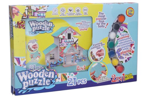 Puzzle 3D dřevěné domeček s barvami. Obsahuje 3D puzzle, barvy, štětec, obrázkový návod. Rozměry složeného domečku: 13,2x9,1x10,5