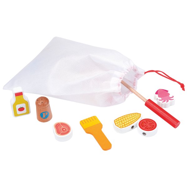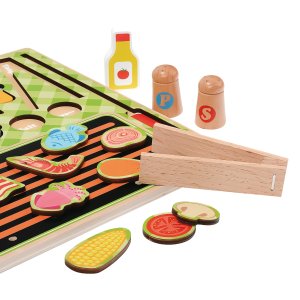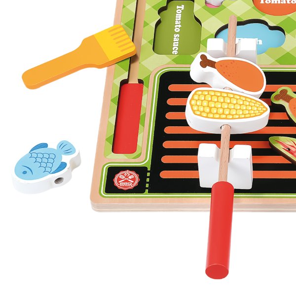 Barevné vkládací dřevěné puzzle. Balení osahuje 33 dílků s pevnou deskou vyrobenou z překližky. Děti se učí rozpoznávat a přiřazovat obvyklé grilovací náčiní. Procvičují zde jemnou motoriku, logické myšlení, koordinaci rukou a zraku. Stimuluje se představivost a rozvíjí se dovednosti potřebné k řešení různých situací. Vhodné pro děti od 36 měsíců. Upozornění: Použití dětmi do 3 let pouze pod dohledem dospělé osoby. Hlavní vlastnosti: 33 dílů a vkládací deskadřevo lakované nezávadnými barvami