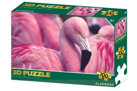 3D puzzle s motivem plameňáka. Balení obsahuje 100 dílků. Rozměry balení 23x15x5 cm. Rozměry složeného obrázku 31x23 cm. Věk 5+