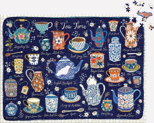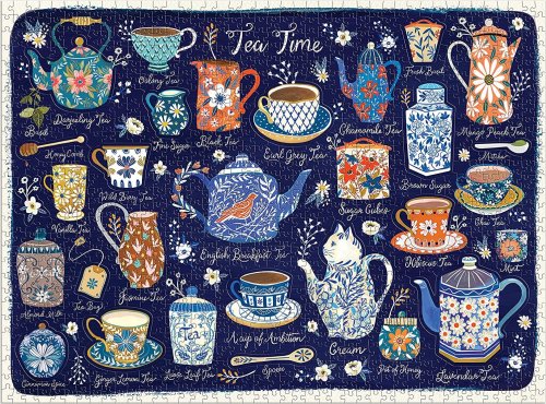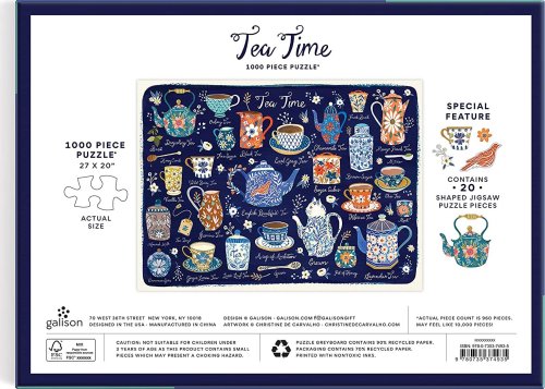 Puzzle obsahuje řadu prvků pro přípravu čaje, jako jsou čajové konvice, podšálky a lžičky. Toto puzzle obsahuje i 20 speciálně tvarovaných dílků. Puzzle je baleno v pevné krabici, pro opětovné použití a skladování. Ideální jako dárek. Autorem obrázku je Christine de Carvahlo. Rozměry balení: 29,2 x 21,6 x 5,1 cm Rozměr puzzle: 68,6 x 50,8 cm Věk: 8+ Materiál: recyklovaný papír a karton Počet dílků: 1000 ks