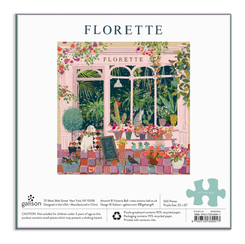 500 dílné puzzle Florette obsahuje okouzlující ilustrace lákavého obchodu s rostlinami od nejprodávanějšího umělce Victoria Ball. Puzzle je baleno v pevných krabicích s matným povrchem. Rozměry balení: ?20,3 x 20,3 x 5,1 cm Rozměry puzzle: 50,8 x 50,8 cm Nevhodné pro děti do 3 let Doporučený věk: 8+ Materiál: recyklovaný papír