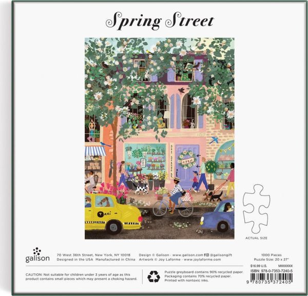 Puzzle jarní ulice je veselá a zábavná jarní pouliční scéna s kvetoucími stromy a zachycující každodenní okamžiky. Puzzle je baleno v pevné krabici, pro opětovné použití a skladování. Ideální jako dárek. Autorem obrázku je Carina Lindmeier. Puzzle jsou vyrobeny za použití významného podílu recyklovaného papíru a nabízí špičkový potisk nezávadnými barvami. Jsou opatřeny matnou povrchovou úpravou, která zajišťuje za všech okolností věrné podání detailů i barev. Jejich zadní strana je potažena hladkým, na dotek příjemným povrchem, díky němuž se při skladování rozloženého puzzle netvoří prach. Spolu s pečlivě zabalenými dílky naleznete v balení také letáček s návodným obrázkem, který zpravidla obsahuje další informace o tvůrcích a pozadí vzniku díla. Dodáváno v mimořádně pevné a poutavě zpracované kartonové krabičce vyrobené z recyklovaného kartonu a udržitelně získaných materiálů s certifikací FSC®. Rozměry balení: 20,3 x 20,3 x 4,1 cm Rozměr puzzle: 50,8 x 68,5 cm Věk: 8+ Materiál: recyklovaný papír a karton Počet dílků: 1000 ks