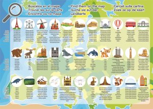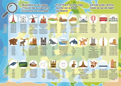 Zeměpisné puzzle pro děti s ilustrovanou mapou Evropy. Názvy moří a oceánů jsou v anglickém jazyce. Součástí balení je i informační leták s názvy zvířat či památek (španělsky, francouzsky, portugalsky, anglicky, německy, italsky, nizozemsky). Jakmile puzzle poskládáte, můžete si zahrát na hledání obrázků. Kdo je najde všechny?