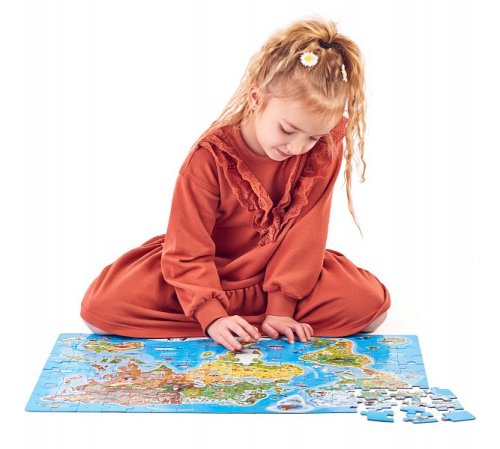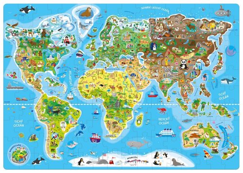 Milujete cestování a skládání puzzle? Pak je tato mapa světa přesně pro vás. Zeměpisné puzzle pro děti s mapou světa a ilustracemi v podobě světových památek a turisty vyhledávaných míst. Puzzle vám pomohou naučit se jaká zvířata v daných oblastech žijí, jaké pamětihodnosti, stavby či přírodní útvary zde naleznou. Na puzzle najdete Eiffelovku, pyramidy nebo třeba sochu Svobody. Obrázky od českého výtvarníka. Počet dílků: 160 ks. Rozměr výrobku: 67,5x 47,5 cm. Rozměr balení: 31x22,5x7 cm. Věk: 3+