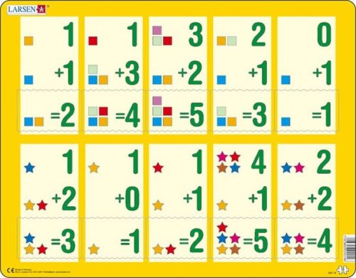 Puzzle Malé sčítání 1 – 5 s 10 dílky pro začátečníky. Výuková skládačka LARSEN poskytuje praktický trénink pro procvičování počítání do 5. Úkolem dítěte je nalezení dílku, který odpovídá danému matematickému zadání a dosahuje stejný výsledek. Každý dílek má odlišný tvar a celé puzzle lze složit pouze tehdy, jsou-li všechny dílky správně umístěny.
