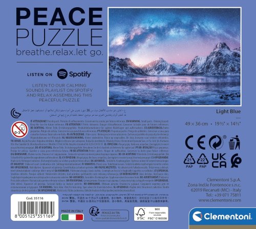 Skládání jako meditace. Uvolněte se, dýchejte, relaxujte... a skládejte. Řada Peace Puzzle od Clementoni nabízí dvojnásobný relax. Kombinuje totiž skládání puzzle a poslech hudby navozující pocit klidu a míru. Pečlivě vybrané obrázky překrásné přírody vyvedené v decentních barvách v kombinaci s příjemnou hudbou blahodárně působí na naše smysly. Puzzle obsahuje odkaz na originální playlist Spotify s relaxační hudbou a zvuky, vytvořený speciálně pro Clementoni Peace Puzzle. Rozměr složeného puzzle cca 49 x 36 cm