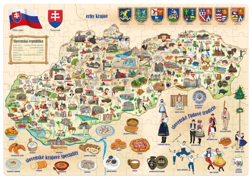 Milujete cestování a skládání puzzle? Pak je tato mapa Slovenské republiky přesně pro vás. Zeměpisné puzzle pro děti s mapou Slovenské republiky a ilustracemi v podobě místních památek a turisty vyhledávaných míst. Puzzle vám pomohou s objevováním zvířat v daných oblastech, pamětihodností, staveb či přírodní útvarů. Obrázky od českého výtvarníka.
