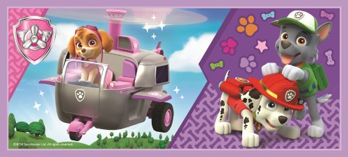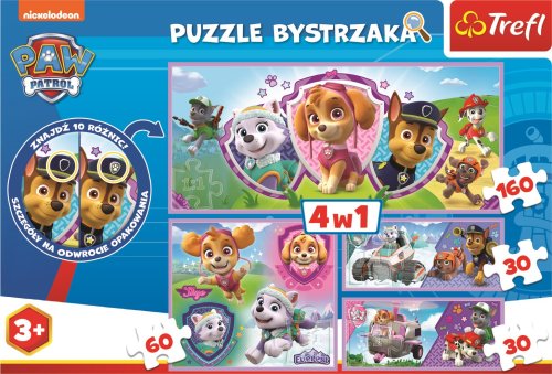 Puzzle od výrobce TREFL, kde zábava nekončí vložením posledního dílku na své místo. Po poskládání obrázku se totiž můžete pustit do zábavné hry...<br> Na poskládaném motivu hlavního puzzle (největší obrázek na přední straně krabice výrobku) se totiž nacházejí předměty, které na obalu vyobrazené nejsou. Vaším úkolem je najít 10 rozdílů. Kdyby se vám v hledání nedařilo, můžete se podívat do nápovědy na zadní straně krabice. Tak hurá do toho!<br> Kromě hlavního obrázku s deseti rozdíly balení obsahuje ještě další tři puzzle obrázky s odvážnými psími hrdiny.