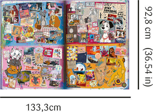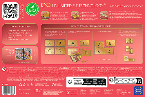 Puzzle kompozice obrázků s ze světa Disney. Každý obrázek je balen samostatně (4x1500 dílků). Díky technologii TREFL Unlimited Fit Technology (UFT) , která umožňuje spojení jednotlivých obrázků mezi sebou, můžete vytvořit libovolnou kompozici obrázků nebo se držet rozmístění dle předlohy.