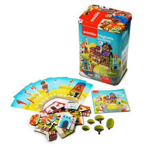 Puzzlika, nová značka puzzlů s moderním kreativním designem, přináší pro malé děti aktivní učení formou zábavné hry. Umíte postavit dům? V plechové krabičce naleznete 10 papírových předloh a 35 velkých magnetických puzzlů, které vám umožní postavit 10 samostatných domů. Plechová krabička slouží nejen jako tematická podložka pro magnety, ale i jako úložný box, díky kterému je tato hra vhodná i na cesty. Puzzle je skvělá hra pro malé děti, která u nich rozvíjí logické myšlení, představivost, kreativitu, jemnou motoriku a různé poznávací znalosti. Puzzle jsou vyrobeny z tvrdého kartonu s lesklým povrchem s magnetickým páskem. Karton byl vyroben z kvalitního, ekologicky pěstovaného dřeva. Puzzle je možné otřít vlhkým hadříkem. Nevhodné pro děti do 3 let. Vyrobeno v Evropě.
