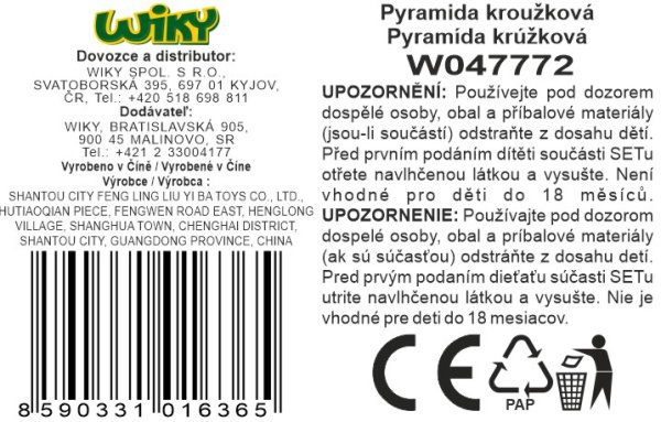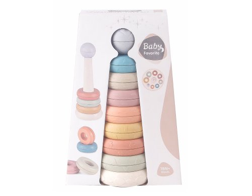Pyramida kroužková. Rozměry věže 8x2x20,7 cm. Balení obsahuje 8 kroužků.
