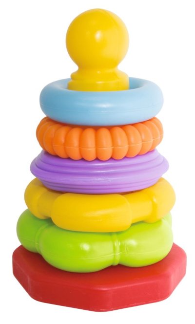 Pyramida s barevnými kroužky napomáhá rozvoji motoriky a schopnosti kombinování. 5 barevných kroužků různých tvarů. Výška pyramidy 20 cm. Materiál plast.