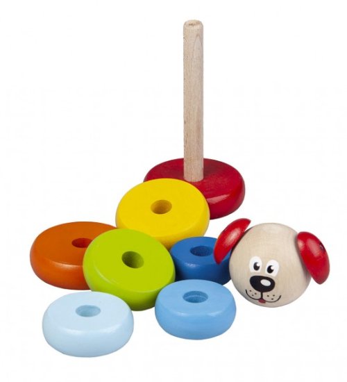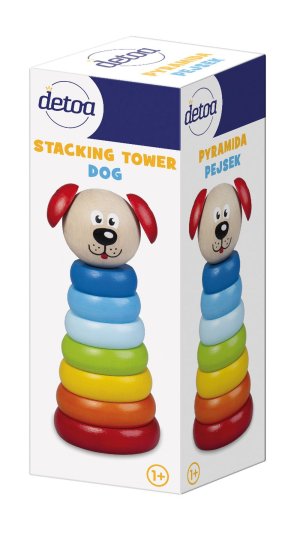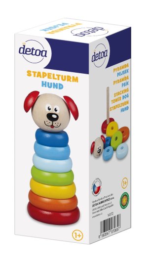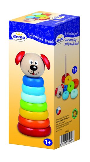 Skládací pyramida pomáhá rozvíjet motoriku rukou a představivost dítěte. Výrobek splňuje požadavky EU na bezpečnost hraček