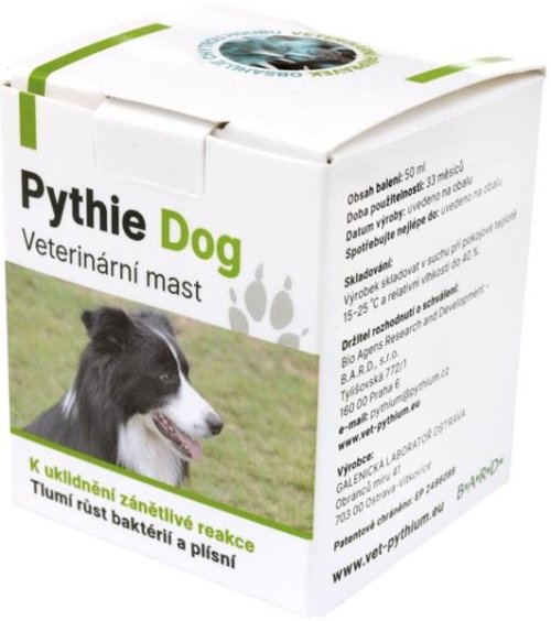 Pythie Dog Veterinární mast - veterinární mast je vhodná při špatně se hojících nehlubokých ranách, při drobných kožních a slizničních poraněních, oděrkách, ztvrdlé či šupinaté kůži, hmyzím bodnutí, popáleninách a jiných drobných poraněních. Díky svému složení přispívá k tlumení růstu baktérií a plísní a uklidnění zánětlivé reakce. Používá se k podpoře hojení a tím jeho urychlení, tlumení svědění, vyhlazení jizev a regeneraci pokožky psů. Podporuje obnovu a růst srsti. Složení: Petrolatum, Silica, Panicum miliaceum, Pythium oligandrum. Návod k použití: Mast aplikujte na očištěnou a navlhčenou pokožku, slabou vrstvu lehce vmasírujte i několikrát denně. Při aplikaci přípravku nepoužívejte žádné jiné prostředky k ošetření kůže, kromě přípravků s Pythium oligandrum. Upozornění: VETERINÁRNÍ PŘÍPRAVEK – JEN PRO ZVÍŘATA Uchovávejte mimo dosah dětí. Není určeno k vnitřnímu užití. Skladování: Výrobek skladovat v suchu při pokojové teplotě 15–25 °C a relativní vlhkosti do 40 %.
