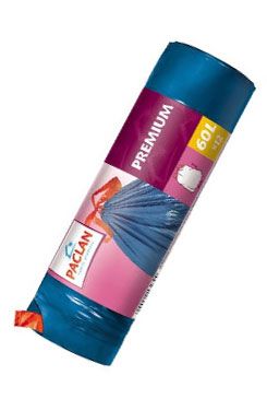 Balení 10 kusů modrých zatahovacích pytlů na odpatky s objemem až 60 l. Uchovávejte mimo dosah dětí. Ostré předměty zabezpečte.