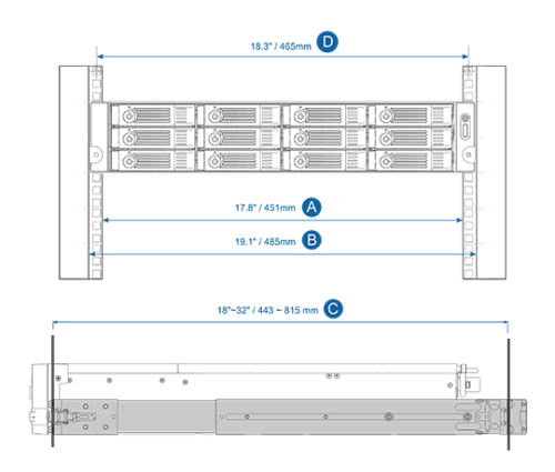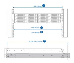 Note: This rail kit is designed for racks with 25-inch mounting depth. You may need to reserve some space when installing and adjusting the rail kit for racks with 18-inch mounting depth. For installation details, click https://qnap.to/rail-b02.